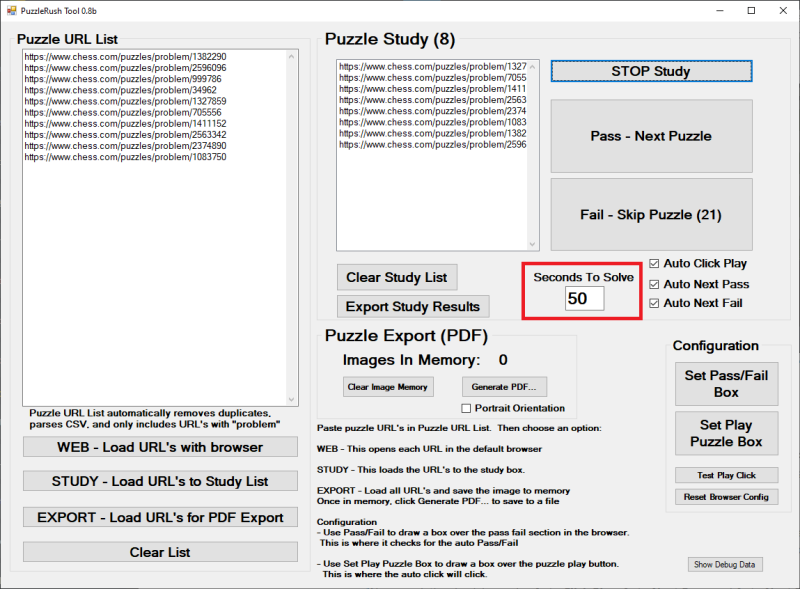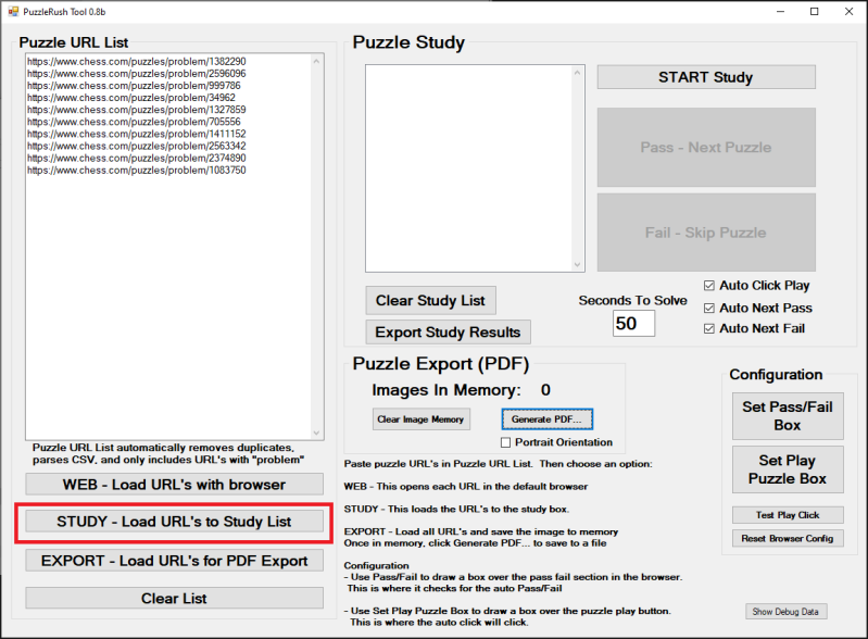 This is the feature we use the most with this tool. You paste in a list of URL's to study and the tool will load each puzzle one at a time and in separate window that is an integrated browser. The tool will automatically click the green play puzzle button and auto detect if the puzzle is a pass or fail. On fail, the puzzle will be added to the end of the study list so it can be retried later. Once all puzzles are complete, you can click Export Study Results to get a comma separated list of puzzles with the number of attempts. The CSV can be pasted directly into the Puzzle URL List window if you want to retry specific puzzles.