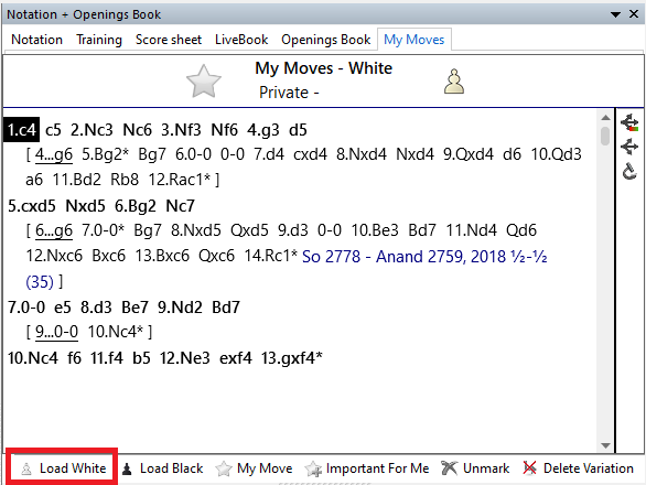 Click Load White and observe your moves are loaded