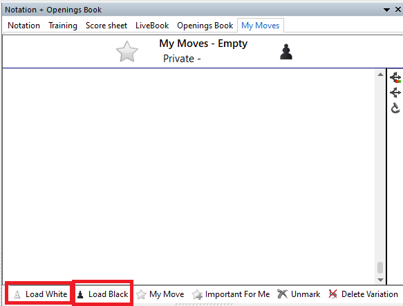 This section covers resetting the moves used for opening training. You need to do this every time you switch to a new variation. If you do not reset MyMoves then your training will be a merger of what exists in MyMoves along with the new opening you want to train. This is useful if you want to train multiple openings at the same time, but for simplicity, just reset MyMoves.