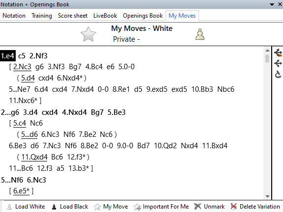 Commentary/complaint: Considering all the options available in Fritz, one would think they could add a button to mark all White or Black moves as My Moves! I may write an app/script to do this, but for now just enjoy the clicking. Fortunately you only have to mark the last move in each variation - you do not need to mark every white/black move.